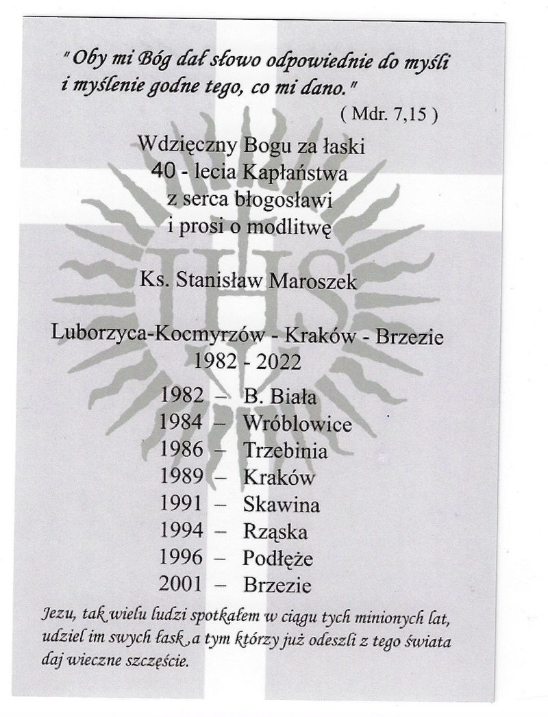 Przejście na emeryturę księdza proboszcza Stanisława Maroszka jest równocześnie związane z jego jubileuszem 40 lat posługi kapłańskiej. Po uroczystej Mszy Świętej, która odbyła się w ostatnią niedzielę czerwca w 2022 roku, przedstawiciele parafian oraz służby liturgicznej złożyli podziękowanie za 21 lat pracy naszej wspólnocie.