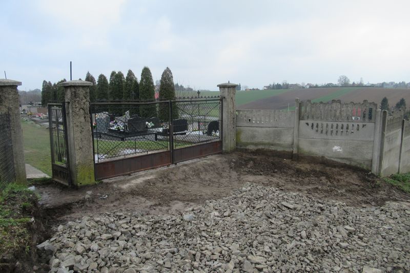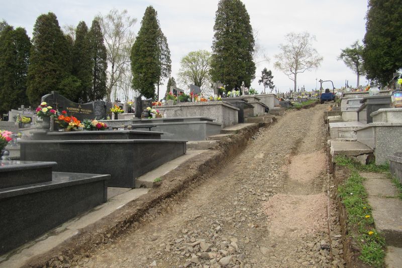Po świętach ruszyło pełną parą zapowiadane brukowanie ścieżek na naszym cmentarzu parafialnym. Niektóre prace przerażają odwiedzających groby, ale są one konieczne do wykonania przy tak wymagającym zleceniu. Już przed świętami wycięto drzewa przy alejce prowadzącej od głównej bramy oraz świerki w dolnej części cmentarza. Obecnie utwardzane jest podłoże pod kostkę brukową na zejściu w dół cmentarza. Zwłaszcza tutaj trzeba bardzo uważnie poruszać się - przejście jest mocno utrudnione. Z nieoficjalnych źródeł wiemy, że w tej części, będą zbudowane "schody", które ułatwią poruszanie się w najbardziej stromym miejscu. Od zachodniej strony - za ogrodzeniem - została już utwardzona kamieniem droga prowadząca do dolnej bramy.