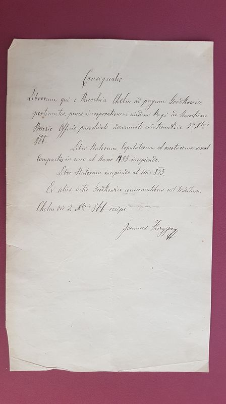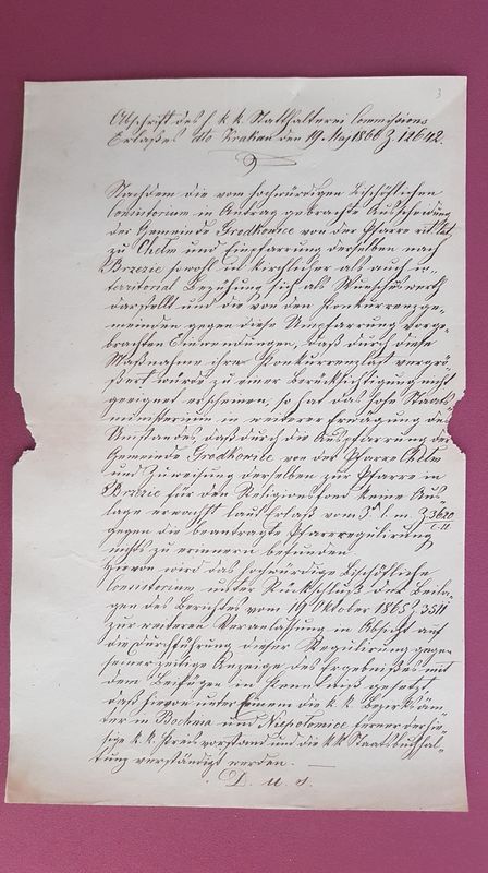Nie dotarliśmy do informacji jaka była oficjalna przyczyna zmiany parafii przez naszą wieś, ale 14 grudnia 1865 roku naczelnik CK Urzędu Powiatowego w Bochni prosi proboszcza z Chełmu, o przybycie wraz z dziekanem z Wiśnicza, na zebranie komisji dotyczącej odłączenia gminy Grodkowice z parafii Chełm. Komisja odbyła spotkanie 18 grudnia 1865 roku. W rezultacie, 3 maja 1866 roku nasza wieś została oficjalnie wydzielona z parafii w Chełmie i przydzielona do parafii Brzezie. Władze kościelne wraz z komisarzem cywilnym, zarządziły przekazanie tej informacji do wszystkich okolicznych parafii i urzędów, w celu jej upublicznienia. Ponadto proboszcz w Chełmie został zobowiązany do przygotowania ksiąg parafialnych, celem przekazania ich do Brzezia. Oficjalny charakter wydarzenia wynikał także z jednoczesnej zmiany dekanatu oraz wyższych władz kościelnych (z Tarnowa przeszliśmy pod Kurię w Krakowie). Dnia 2 października 1866 roku proboszcz z Brzezia - J. Krajger, złożył oświadczenie, że przyjął księgi parafialne dotyczące Grodkowic od parafii Chełm.