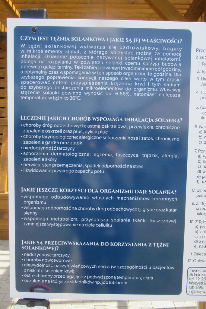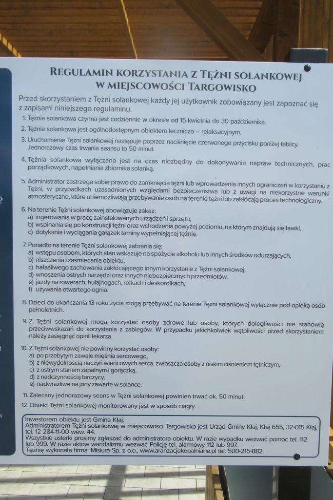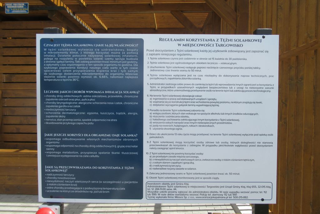 Największa i najpiękniejsza tężnia w okolicy znajduje się przy Kopalni Soli w Wieliczce. Można tam spacerować i wdychać zdrowe powietrze. Nas cieszy, że będziemy mieć możliwość skorzystania z inhalacji „po sąsiedzku” – w Targowisku tuż obok Orlika i miejsca obsługi rowerzystów. Aby ją uruchomić wystarczy nacisnąć czerwony przycisk przed wejściem. Można do tężni udać się z książką, posiedzieć na ławeczce i miło spędzić godzinkę wdychając to co cenne w solance. Są jednak przeciwwskazania do korzystania z tężni - na przykład dla osób z poważnymi problemami kardiologicznymi i nowotworowymi. Miejsce to będzie czynne od wiosny do późnej jesieni. Na tablicy przed wejściem przeczytamy dokładnie o zaleceniach i przeciwwskazaniach oraz o zasadach przebywania na terenie obiektu. Z pewnością monitoring sprawi, że obiekt będzie wszystkim służył dłużej.